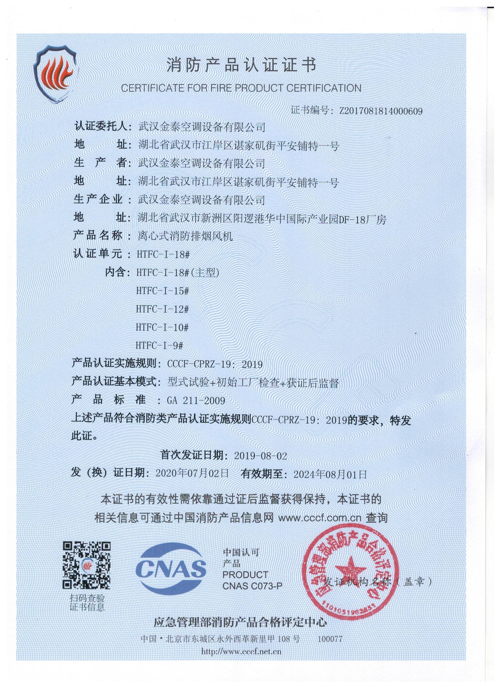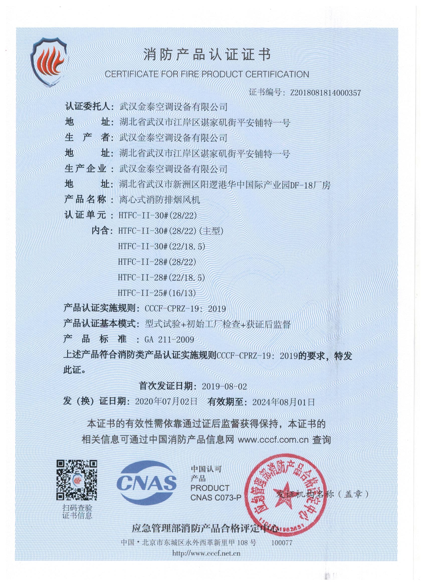 武漢金泰空調設備有限公司 是國內長期專注于民用風機、工業風機領域的標桿企業:專業生產消防排煙風機系列、排煙防火閥系列、一般通風機系列(軸流式、離心式、屋頂式、壁式、隧道式、射流式)、風口、風管等消防及通風設備。產品經公安部消防產品合格評定中心評定符合消防產品CCC標準;經中國合格評定國家認可委員會認證的檢驗所檢驗合格;經國家防火建材質量監督檢驗中心(四川中心)火燒實驗,耐火性能達標。